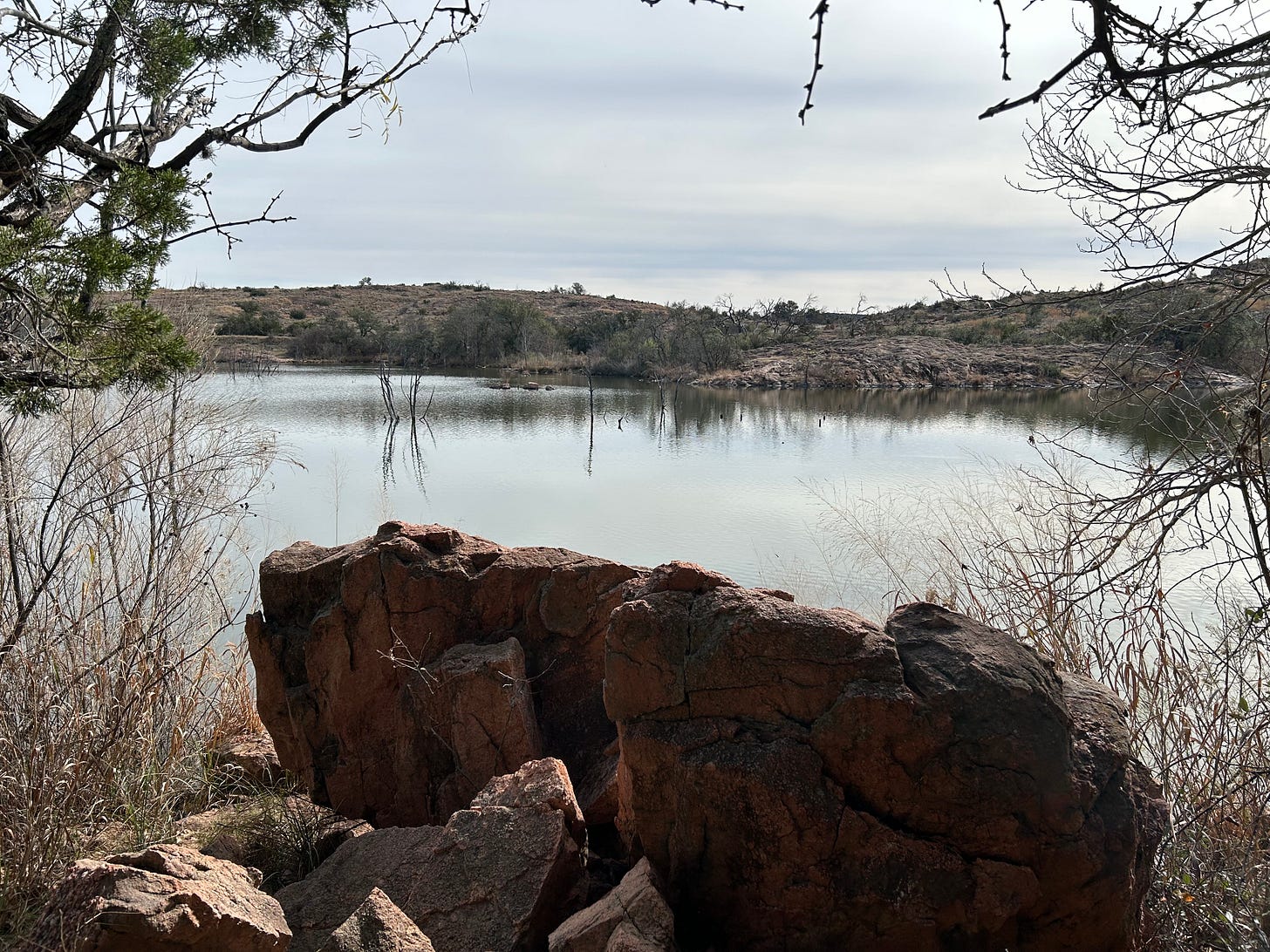 Which doesn't mean much if you are directionally challenged. I was hiking with my Gen Z daughters and we got a little lost as we walked on ground that has been around for thousands of years. But we found our way back to the car as we avoided pointing fingers and panicking. We looked for the green markers. Interestingly some markers were obvious and others were green dots on the rocks. After all, a state park with red rocks and boulders embedded with quartz cannot have poles drilled into it so they painted green dots.